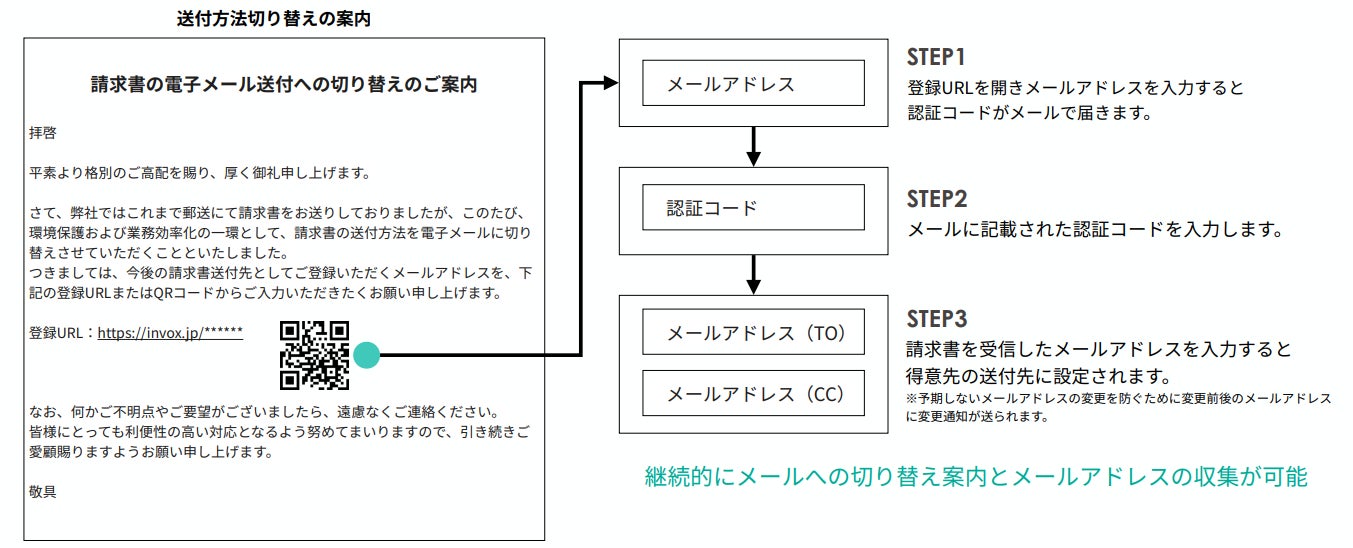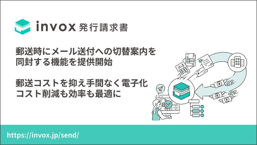 株式会社invox(本社:東京都新宿区、代表取締役:横井 朗)は、開発・運営する「invox発行請求書」に請求書の郵送時にメール送付への切替案内を同封する機能を搭載したことを報告いたします。本機能の利用により、郵送による請求書送付の際に電子送付への切り替えを継続的に促しながら、取引先のメールアドレスを効率的に収集が可能です。本機能を活用いただくことで、ペーパーレス化を推進し、導入企業の郵送コストの削減と環境負荷軽減を実現できます。