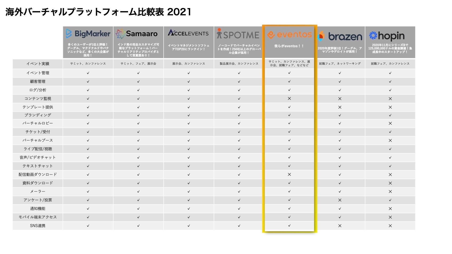 2020年に我々が提供するeventosもオンライン化に舵を切り、ライブ配信機能を皮切りにオンラインMTGやオンラインチャット、近年ではMAツールの連携や一括メール送信機能など、イベント当日だけではなく、イベント前やイベント後にも継続して顧客管理を実現する、マーケティングツールに現在進化を遂げております。