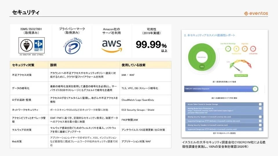 eventosはデータベースにデータ保存を行う際に、自動的に暗号化される仕組み(Amazon RDS暗号化)を利用していますため、万一の場合も個人情報の特定・識別ができないような構成でユーザー様のデータを守る構成を用意しております。