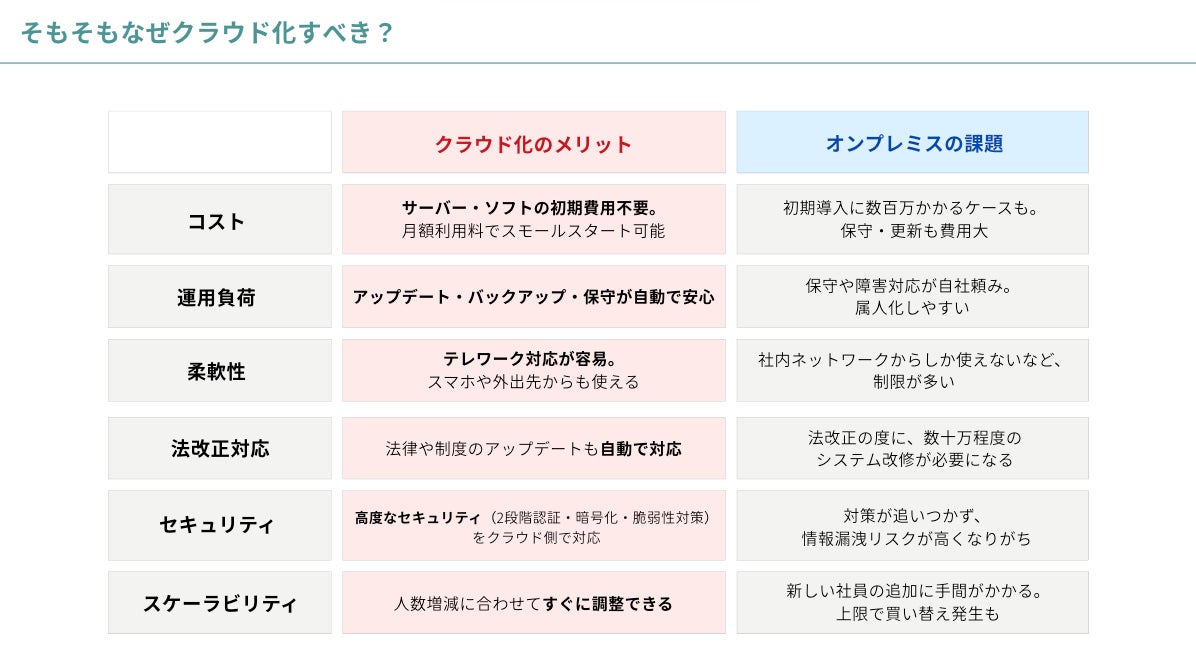 クラウドは、それらを全て解決。時代や社内の変化、法改正に柔軟に対応し、フレキシブルに利用できることは最大のメリットと言えるでしょう。