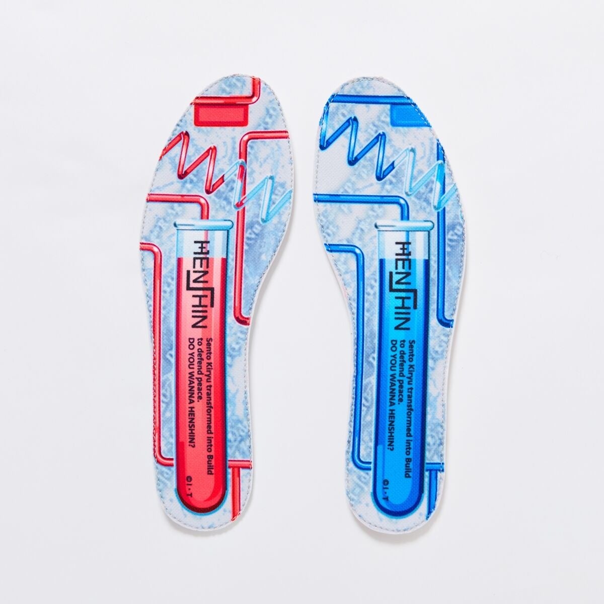 インソールには物理学の数式と試験管を使った実験を再現したデザインで、物理法則を駆使して戦う仮面ライダービルドに変身する様を表現しています。
