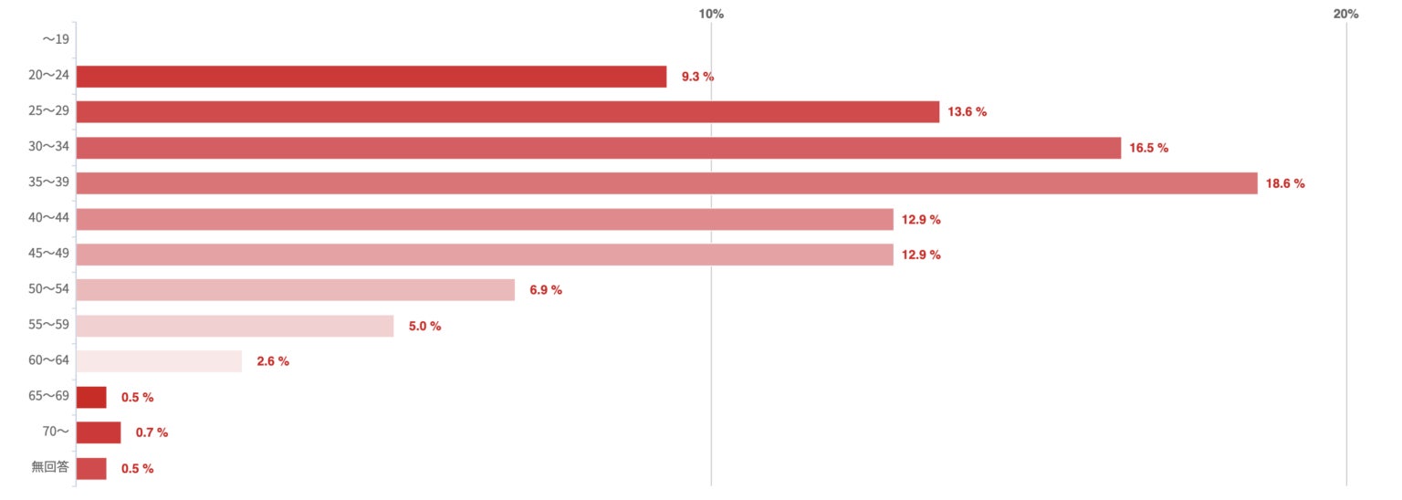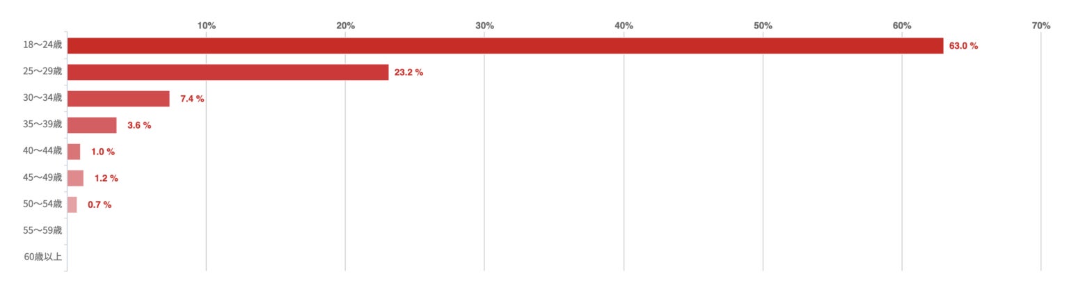 18〜24歳が63%で圧倒的に多く、25〜29歳が23.2%、30〜34歳が7.4&%など、年齢順に続く結果となった。
