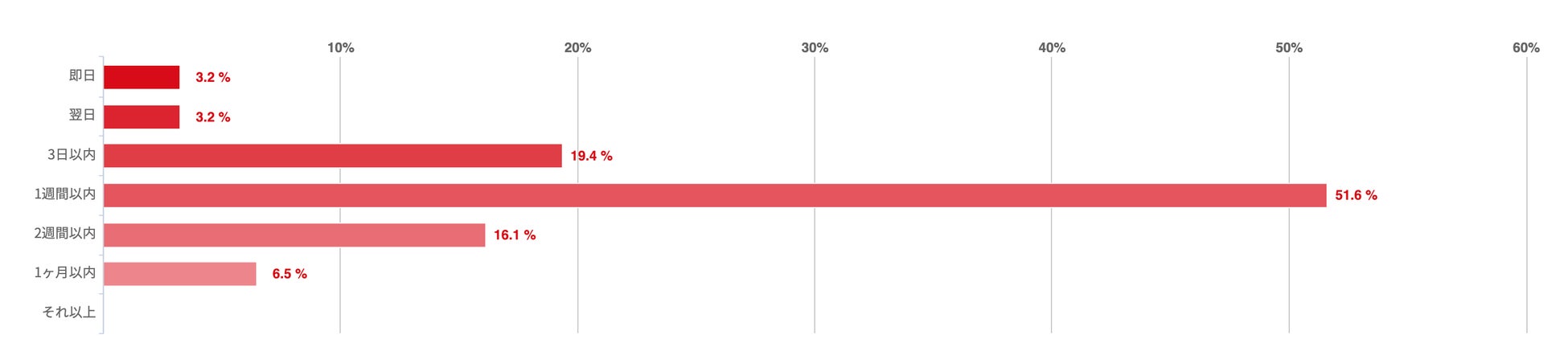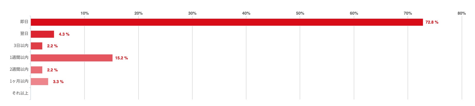 即日発行できたとの回答が72.8%で最も多く、「翌日」との回答と合わせると全体の77%を占める結果となった。