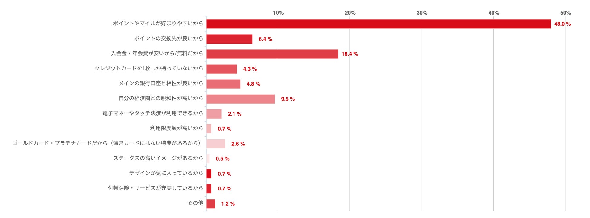 「ポイントやマイルが貯まりやすいから」が48%で最も多く、約過半数の割合を占めた。その他、「入会金・年会費が安いから/無料だから」「自分の経済圏との親和性が高いから」などの回答も多かった。