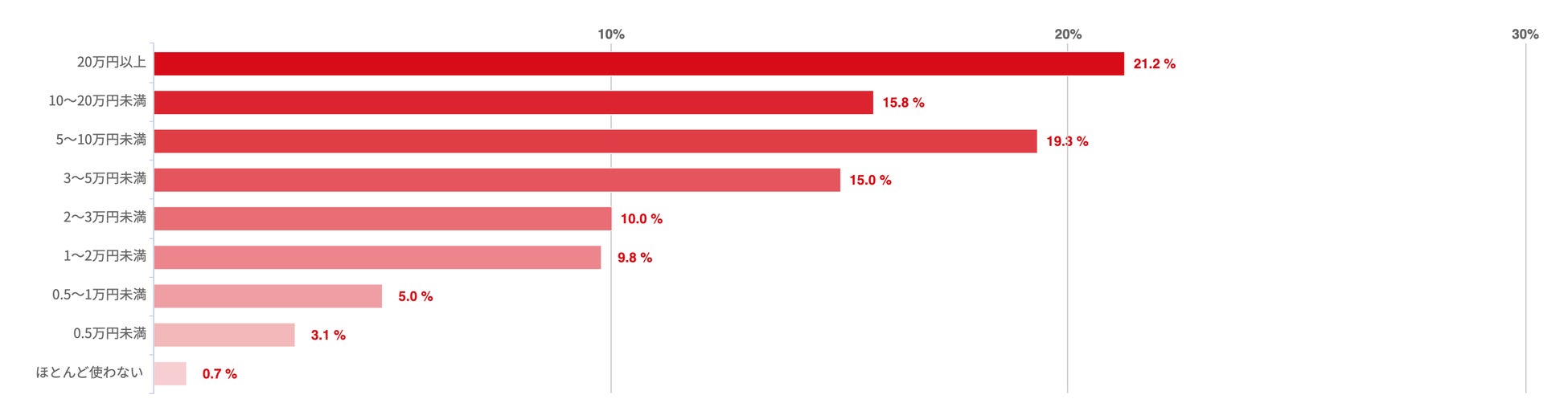 20万円以上利用する人が21.2%で最も多く、「5〜10万円未満」が19.3%でこれに続いた。また、「10〜20万円未満」(15.8%)、「3〜5万円未満」(15%)との回答も多かった。