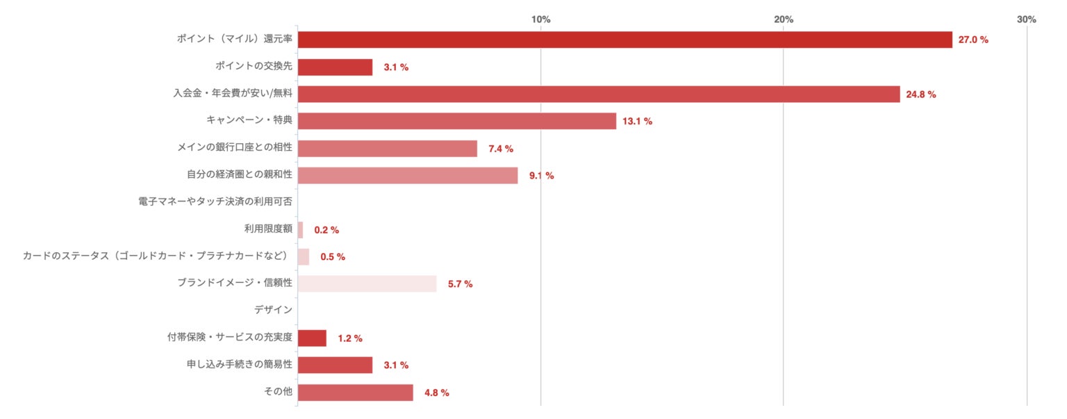 「ポイント(マイル)還元率」が27%で最も多かったが、「入会金・年会費が安い/無料」も24.8%でこれにせまる結果となった。また、「キャンペーン・特典」が13.1%でこれに続いた。