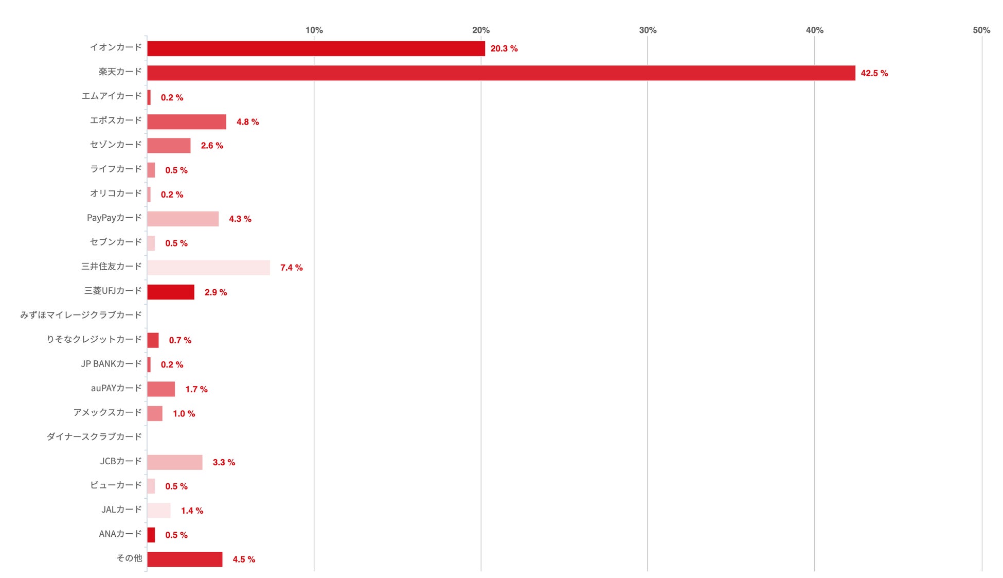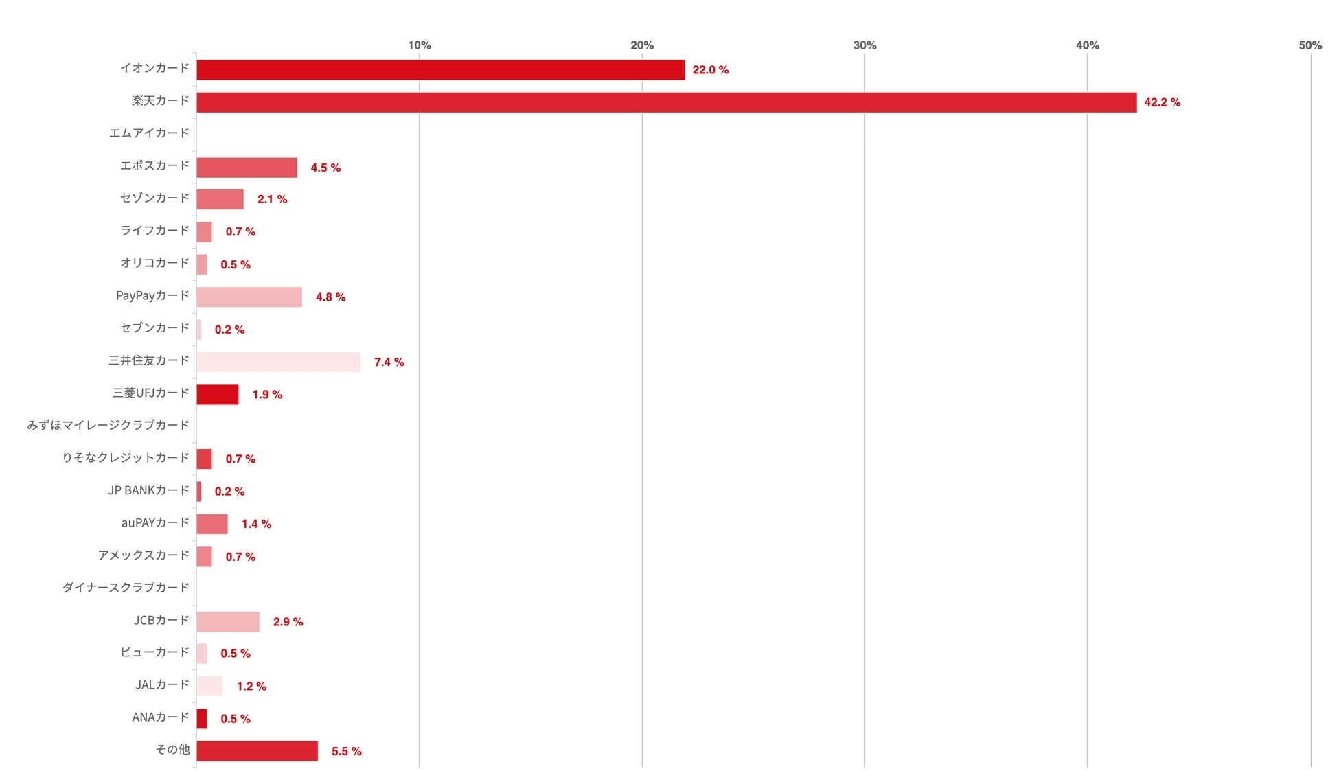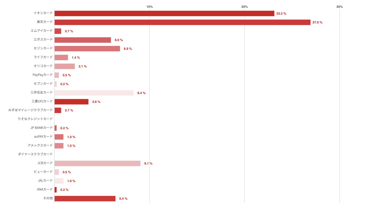 楽天カードが42.5%で最も多く、イオンカードが20.3%でこれに続いた。また、三井住友カードが7.4%で票を集めた他、エポスカードやPayPayカードも一定数の回答があった。