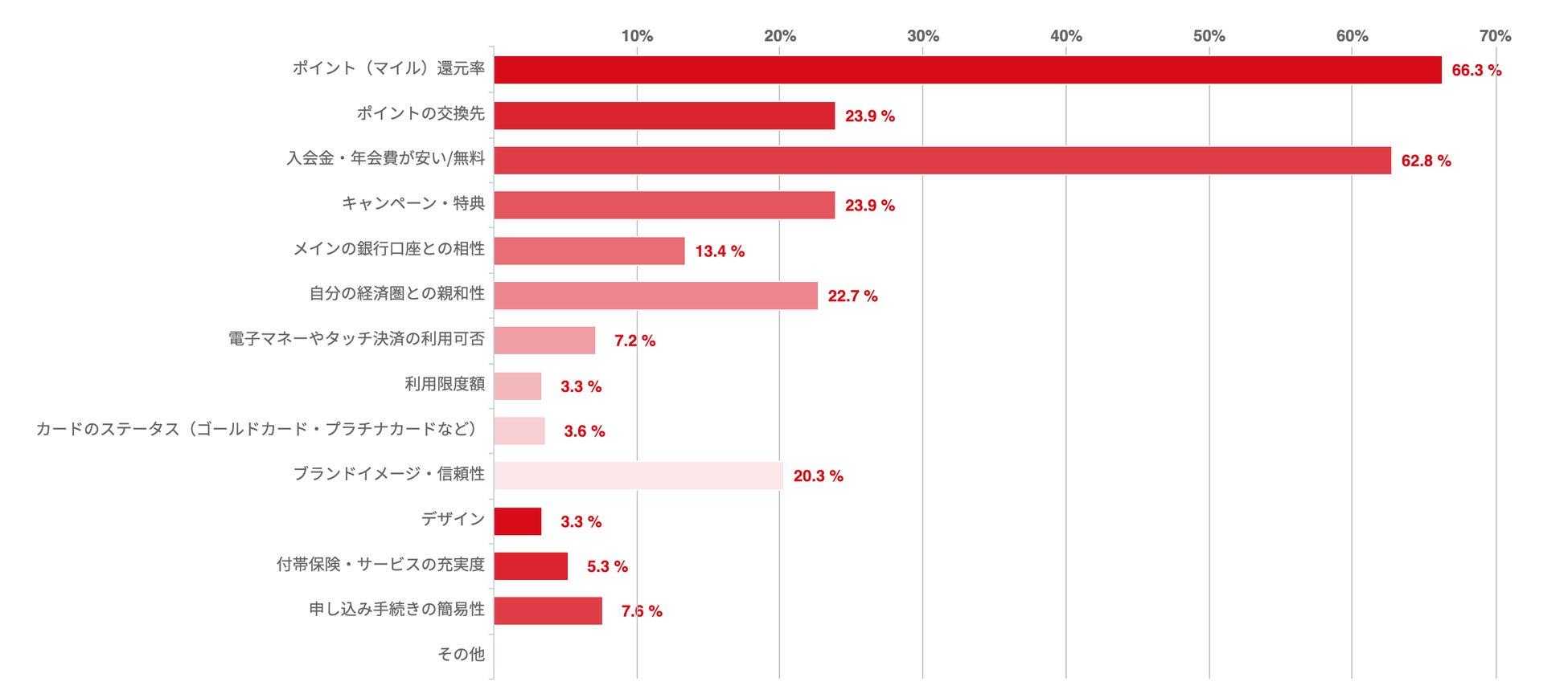 「ポイント(マイル)還元率」、および「入会金・年会費の安さ」を重視している人が圧倒的に多数という結果になった。なお、その他には「ポイントの交換先」や「キャンペーン・特典」を選ぶ人も多かった。