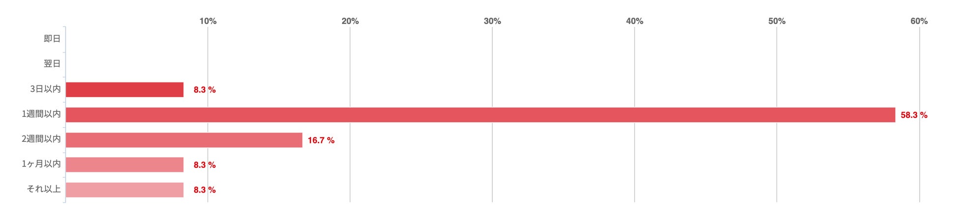 JCBカードも「1週間以内」との回答が58.3%で最も多く、「2週間以内」が16.7%でこれに続いた。なお、「3日以内」「1ヶ月以内」「それ以上」はいずれも同数だったか、即日発行できたとの回答はなかった。