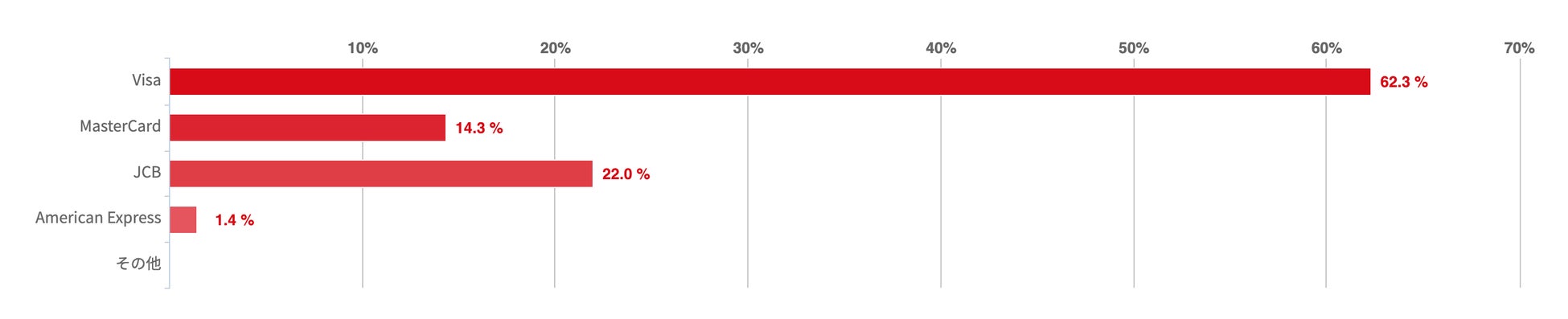 Visaが62.3%で最も多く、JCBが22%、Mastercardが14.3%で続いた。American Expressは全体の1.4%に留まった。