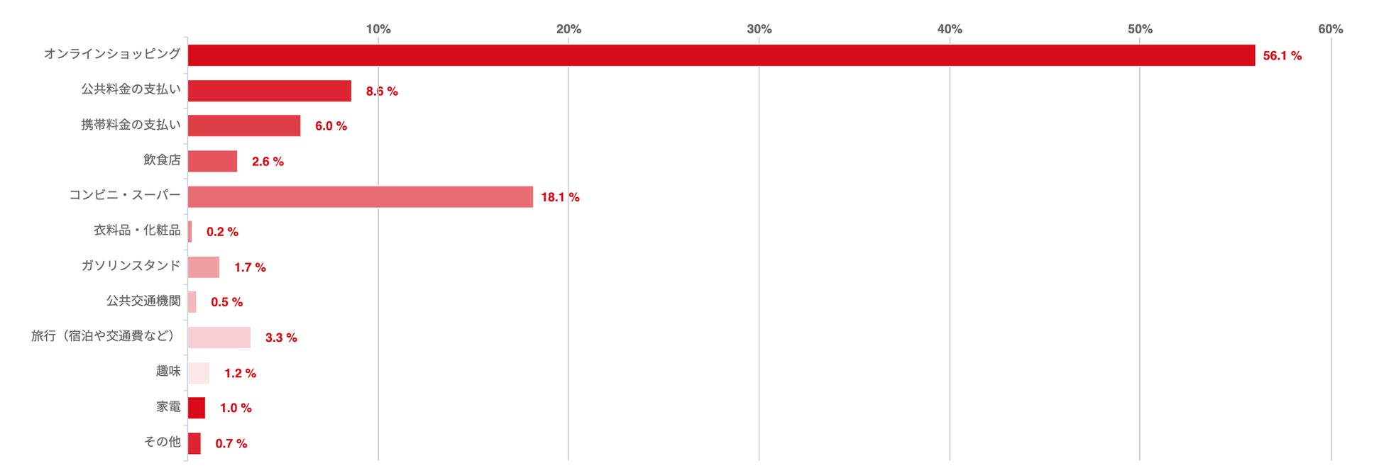 オンラインショッピングが56.1%で圧倒的に多く、コンビニ・スーパー(18.1%)がこれに続いた。また、公共料金や携帯料金の支払いに利用するとの回答も多かった。
