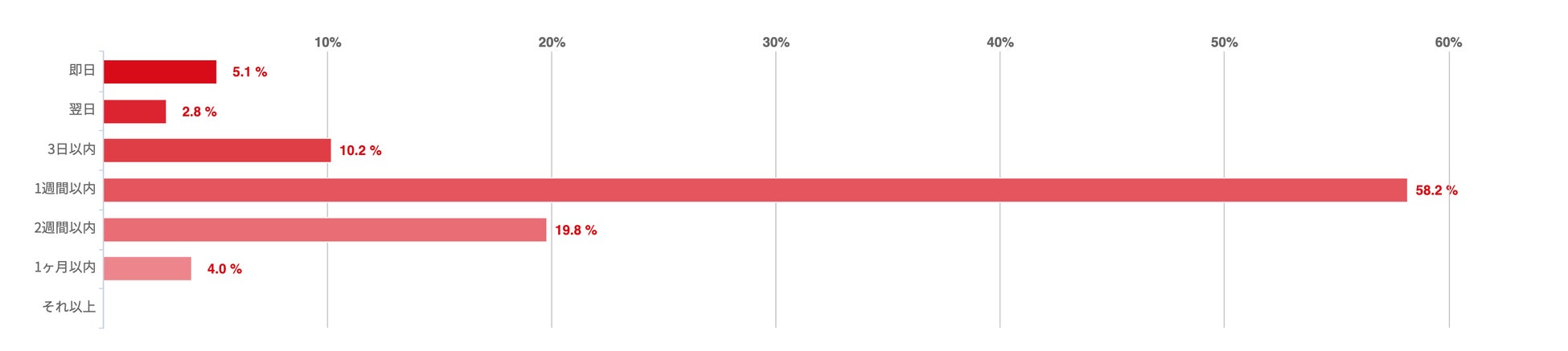 さらに楽天カードについても「1週間以内」との回答が58.2%と最も多く、次に多かったのも「2週間以内」で19.8%だった。また、即日発行できたとの回答は全体の5.1%だった。