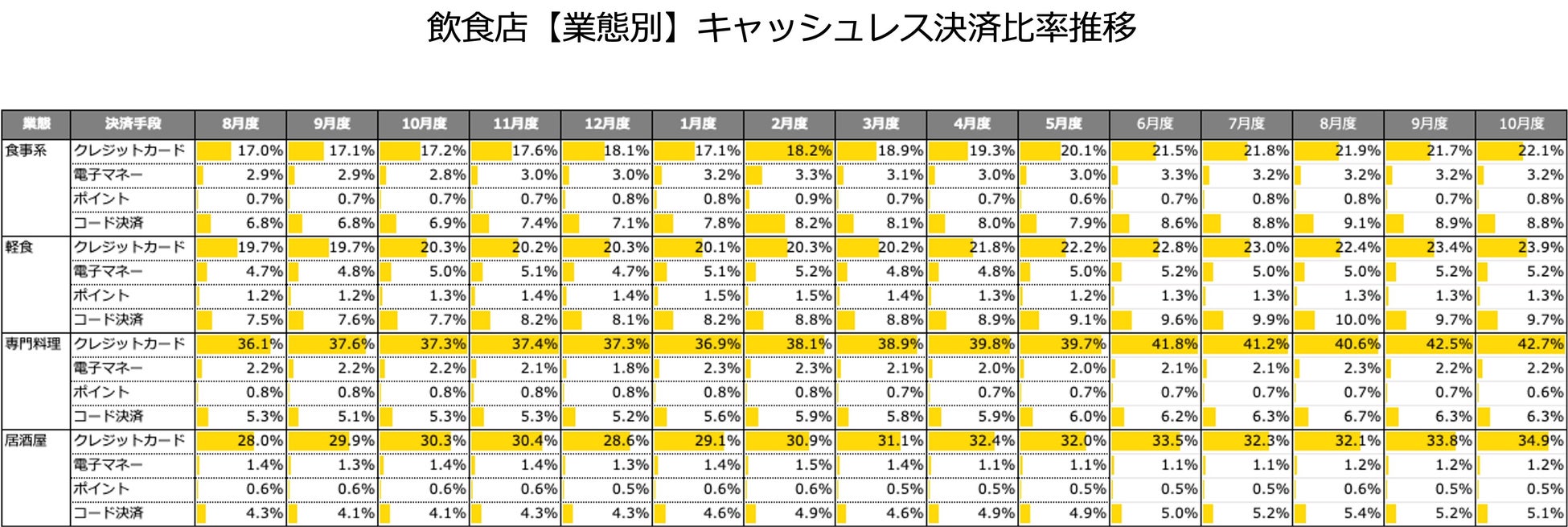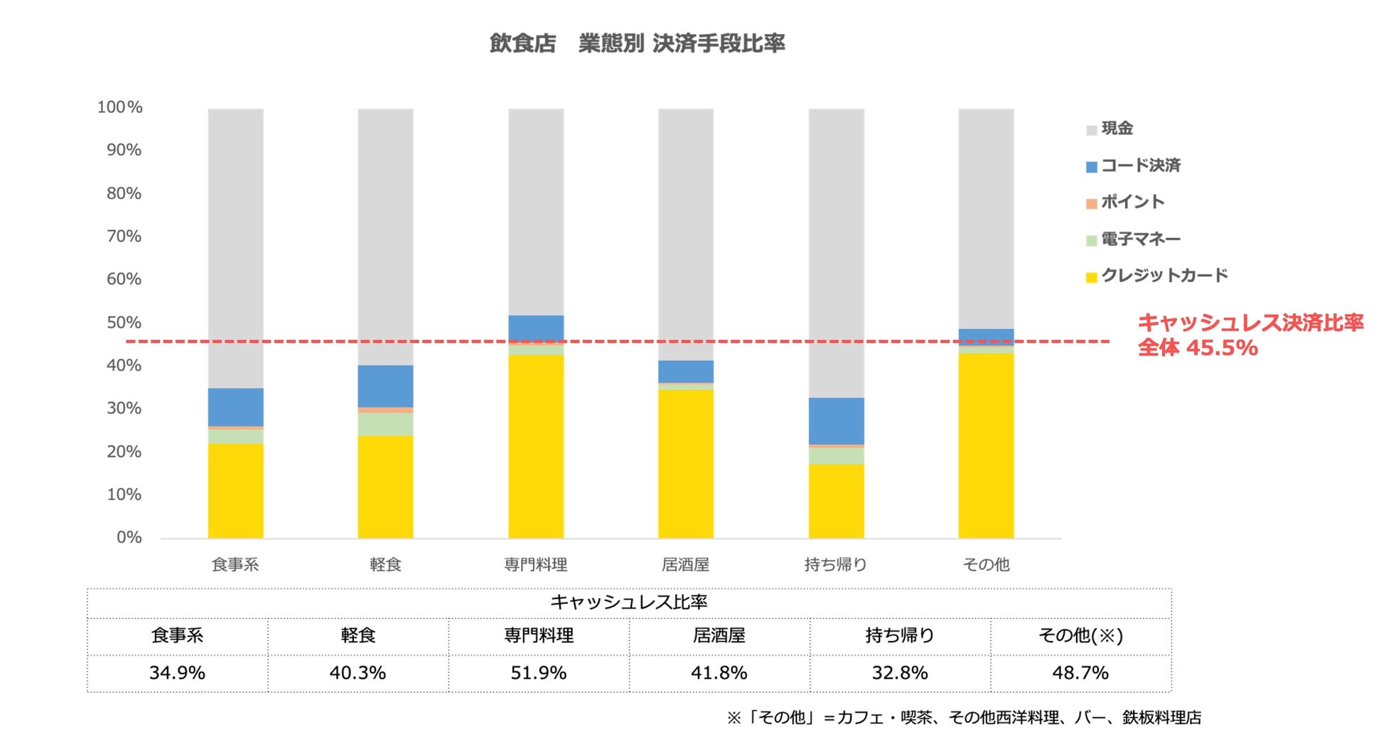 ・業態別のキャッシュレス比率は、専門料理と居酒屋、新たに軽食で40%以上を超えた。