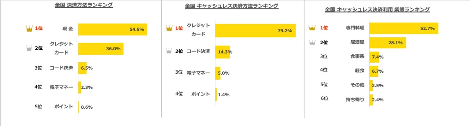 ・キャッシュレス決済方法のランキングは、クレジットカードが79.2%、次いでコード決済は14.3%となった。