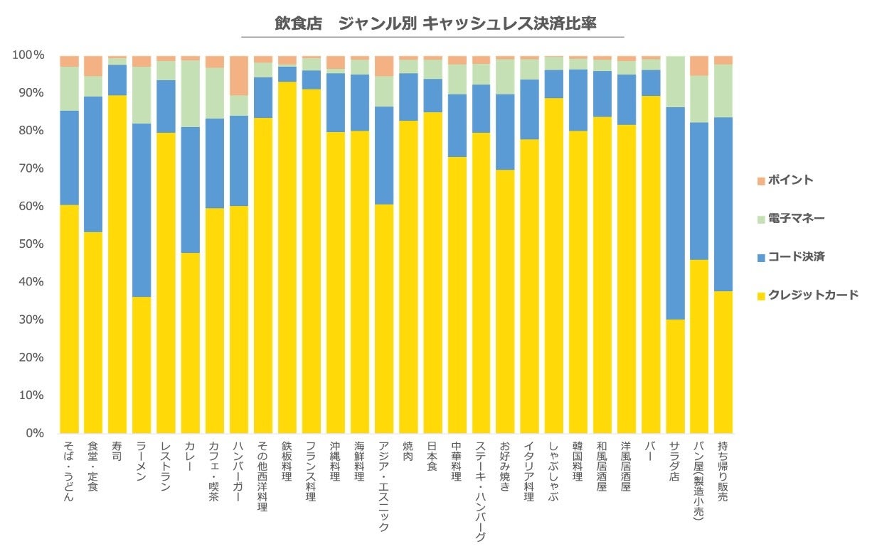 キャッシュレス決済を100%として内訳を見た場合、クレジットカードのキャッシュレス決済比率について、鉄板料理・フランス料理で90%以上を占める。ラーメン・持ち帰り販売・サラダ店でコード決済比率が45%以上を占める。