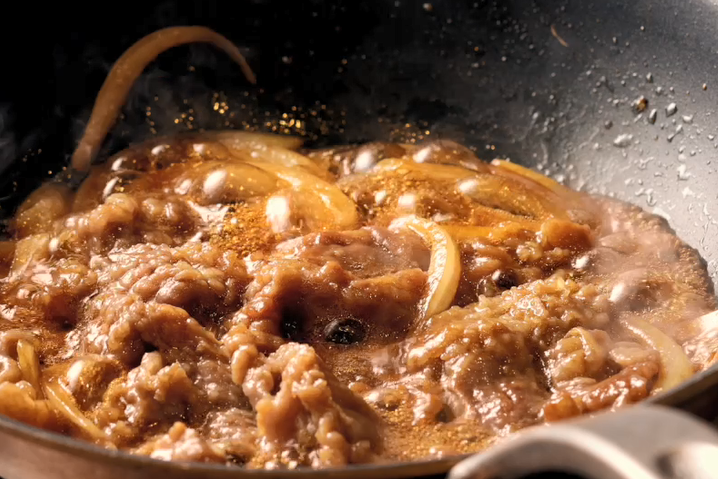 ご注文をいただいてから、牛肉とたまねぎ、醤油ベースのだしの効いた割り下を入れて、じゅわっと焼き上げます。お客さまの目の前で調理するからこそ、焼き上がる音や香ばしい香りが食欲をそそる一杯です。