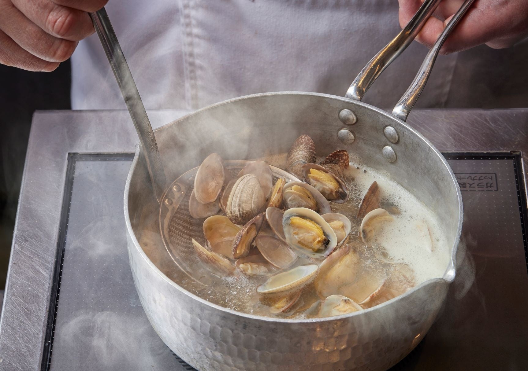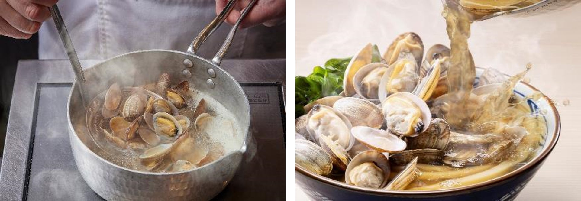 ご注文をいただいてから、北海道産の真昆布と厳選された複数の削り節からつくる風味豊かなかけだしをベースにあさりの旨みを加えた特製だしをたっぷりと注ぎ、殻付きあさりをごろっと手鍋に入れて、旨みを引き出しながら火をいれます。
