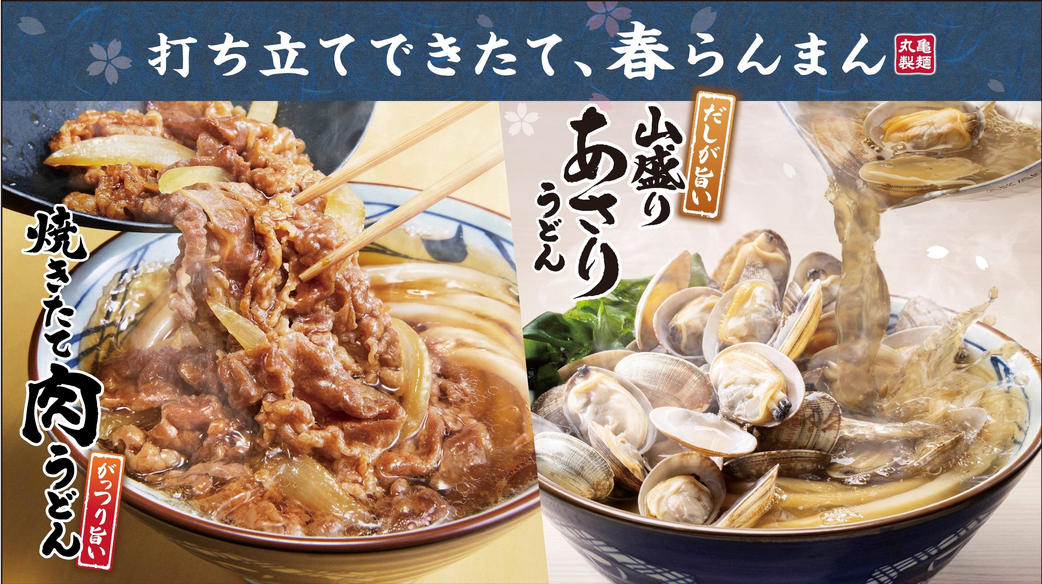 丸亀製麺の2つの人気商品をお楽しみいただける、この春。今日は、ほっこり『山盛りあさりうどん』にしようか。明日は、がっつり『焼きたて肉うどん』にしようか。どちらの商品を食べようかと迷う時間もお楽しみいただけたらと思います。