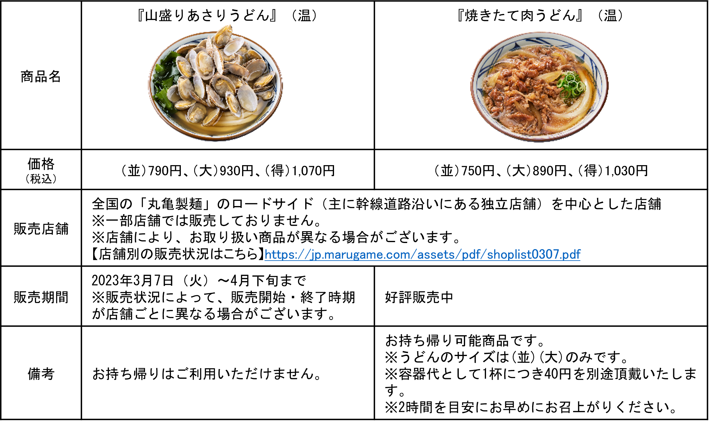 株式会社丸亀製麺(本社:東京都渋谷区、代表取締役社長:山口 寛)が展開する、食の感動体験を追求し、手づくり・できたてにこだわる讃岐うどん専門店「丸亀製麺」は、春限定の定番人気『山盛りあさりうどん』を2023年3月7日(火)~4月下旬まで全国の丸亀製麺にて期間限定で販売いたします。また新しいことが多い春、元気をつけたい時には、がっつりと食べ応えのある『焼きたて肉うどん』もおすすめです。