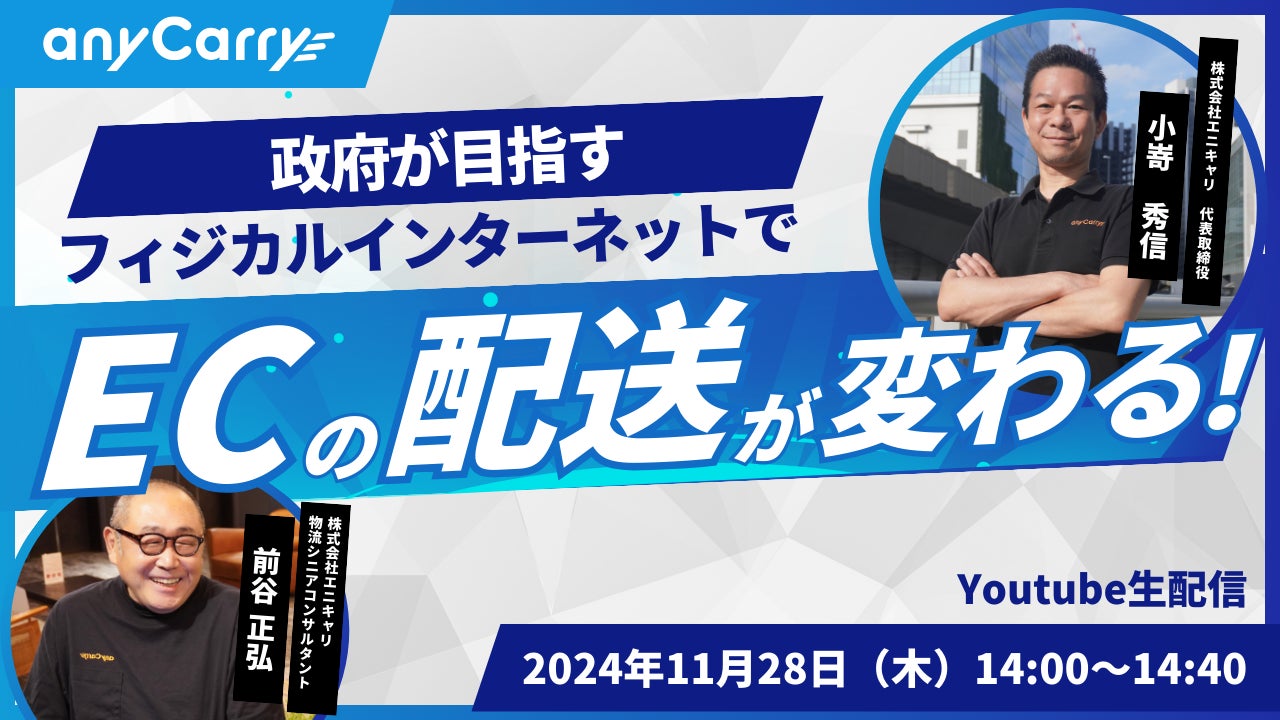 ラストマイル物流に特化した物流ソリューション事業を展開する株式会社エニキャリ(以下当社)は、「政府が目指すフィジカルインターネットでEC配送が変わる!」と題して、11月28日(木) 14時より、YouTubeでライブ配信を行うことをお知らせします。