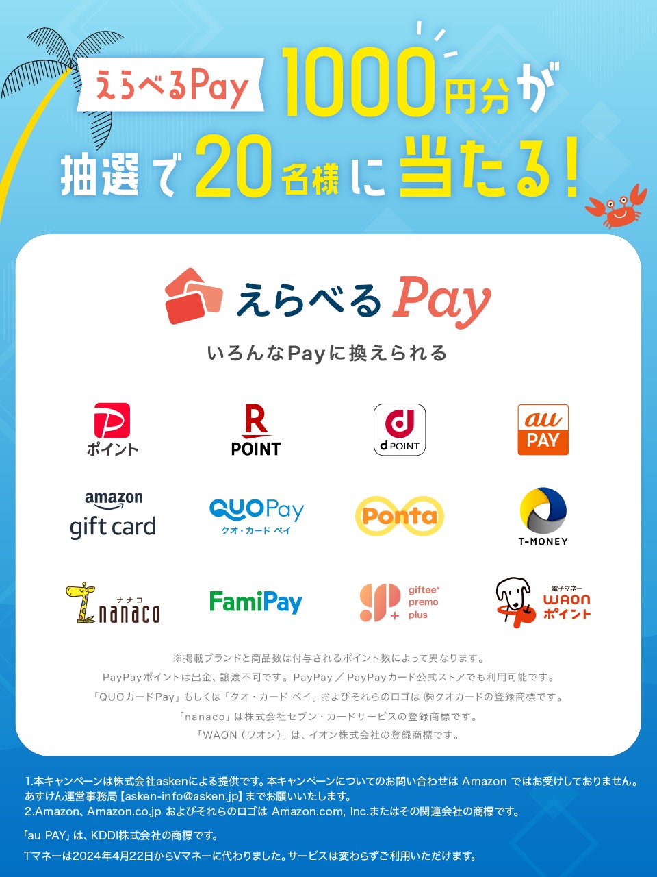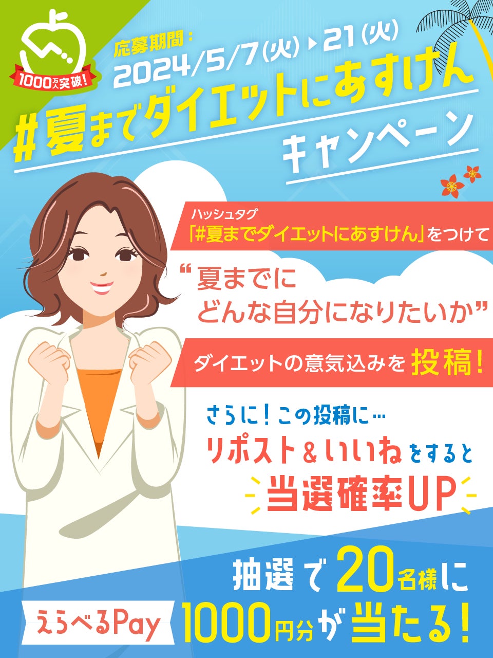 累計会員数1000万人超・国内No.1*¹AI食事管理アプリ『あすけん』の開発・運営を行う株式会社asken(東京都新宿区、代表取締役社長 中島洋、以下「当社」)は、このたび、あすけん公式X(エックス)をフォローし、「#夏までダイエットにあすけん」のハッシュタグを記載した投稿をすると、抽選で「えらべるPay」が当たるキャンペーンを5月7日(火)〜5月21日(火)に開催いたします。