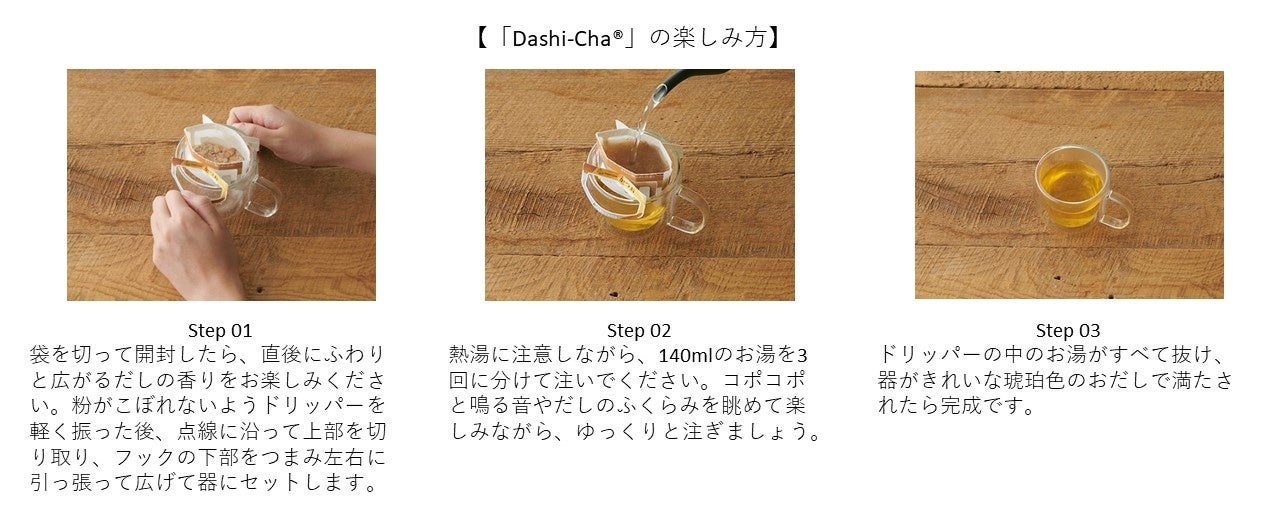 (2)特長:自身でドリップすることで、日常生活の中でマインドフルなひとときを味わえる、厳選しただし素材で作られた“ドリップ式飲むおだし”です。3品種ともにノンカフェインのため、シーンを選ばずお楽しみいただけます。