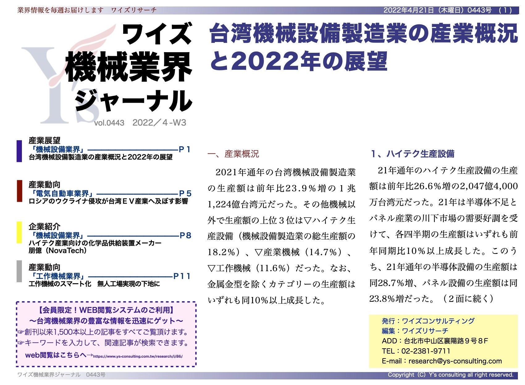 ワイズコンサルティング グループ(本社:中華民国台北市、代表取締役:吉本康志)は台湾機械業界専門誌「ワイズ機械業界ジャーナル」の2022年4月第3週号を発行しました。今週号では、機械設備業界、電気自動車業界、ハイテク産業向けの化学品供給装置メーカーのNovaTech、工作機械業界の動向について紹介します。