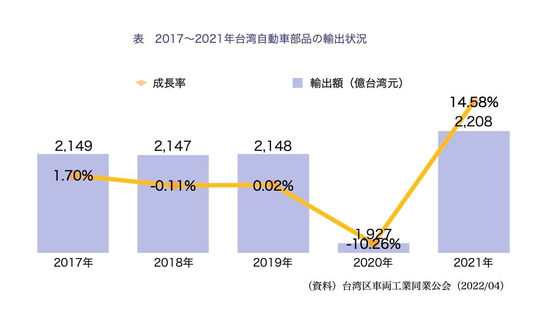 台湾区車両工業同業公会(車両公会、TTVMA)によると、21年の自動車部品産業の対ロシア輸出額は約21億台湾元、全体の約0.95%を占める。一方、ロシアからの自動車部品輸入額は約2,000万台湾元にすぎず、ウクライナ侵攻による自動車部品産業への影響は軽微である。
