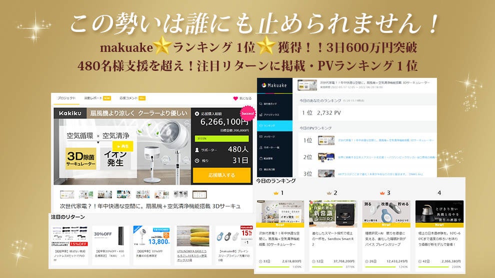 MakuakeでF602サーキュレーターのプロジェクト開始から3日で応援総額700万円を突破、すでに539名を超える皆様よりご支援いただいております。MakuakeランキングとPVランキング1位を獲得し、注目リターンにも掲載されています。いまmakuakeで一番注目されている。
