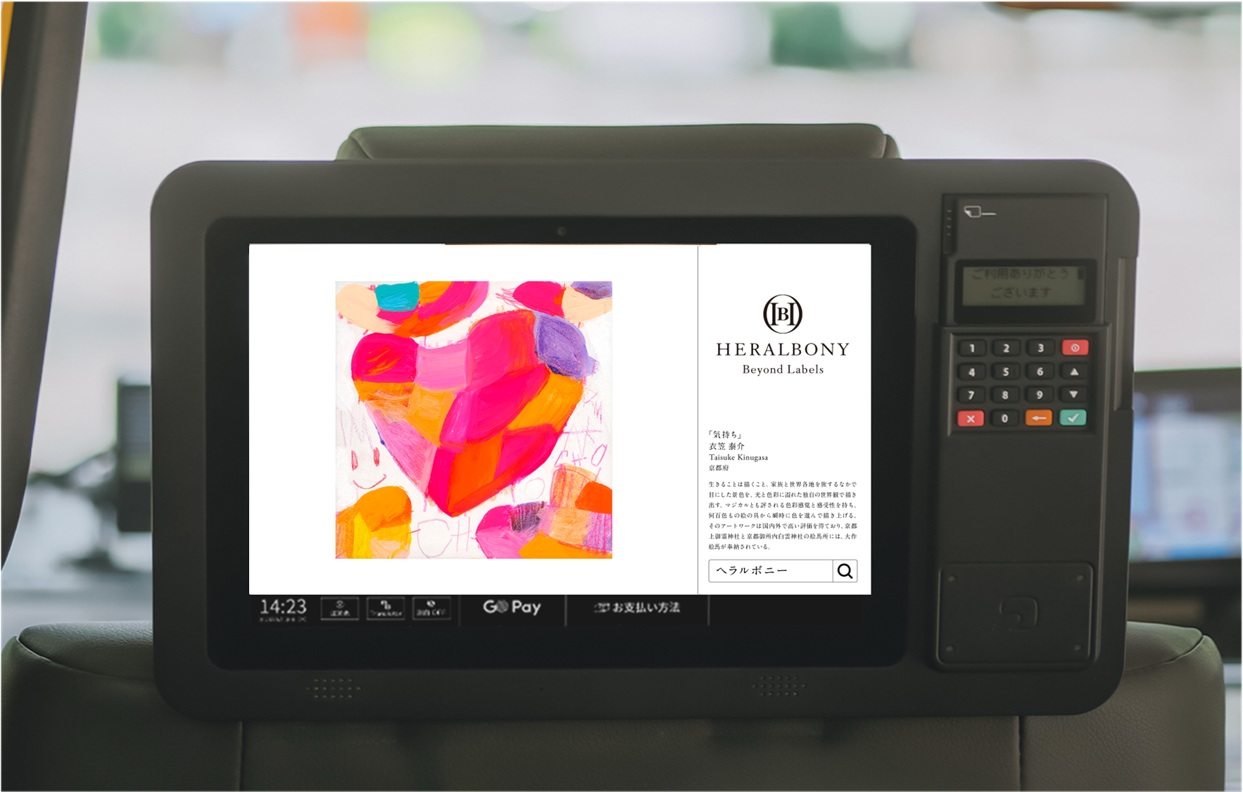 さらに、タクシーメディアTOKYO PRIMEでは、本番組の初回ゲスト・松田 崇弥氏のご出演に合わせて、代表を務める株式会社ヘラルボニーの契約作家たちが描くアート作品をタクシー乗客の皆様にお届けする企画も順次開始します。「異彩」を放つ、アートに触れる乗車体験をお楽しみください。