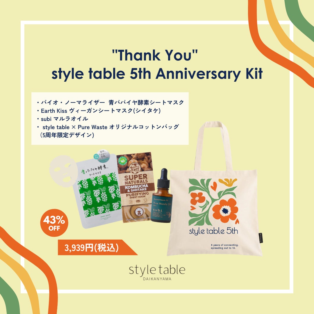 株式会社フラッグ(東京都港区 代表取締役:吹上直子)が運営するstyle table(スタイルテーブル)は、2024年8月31日に5周年を迎えます。数量限定のアニバーサリーキットには、フィンランド発・エシカルアパレルブランド「Pure Waste」とコラボした5周年記念デザインエコバッグと、新商品を含めたおすすめのオーガニック・エシカルコスメをセレクト。