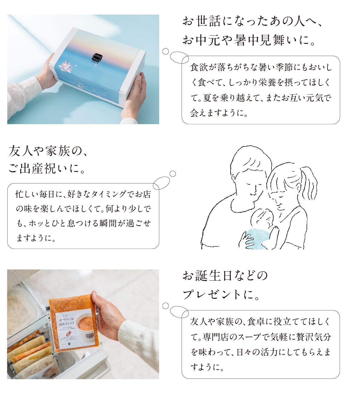 大切なあの方や、お世話になったあの方が元気でいられるよう、身体も心も労ってあげたい。そんな気持ちを、スープの贈りもので伝えてはいかがでしょうか。