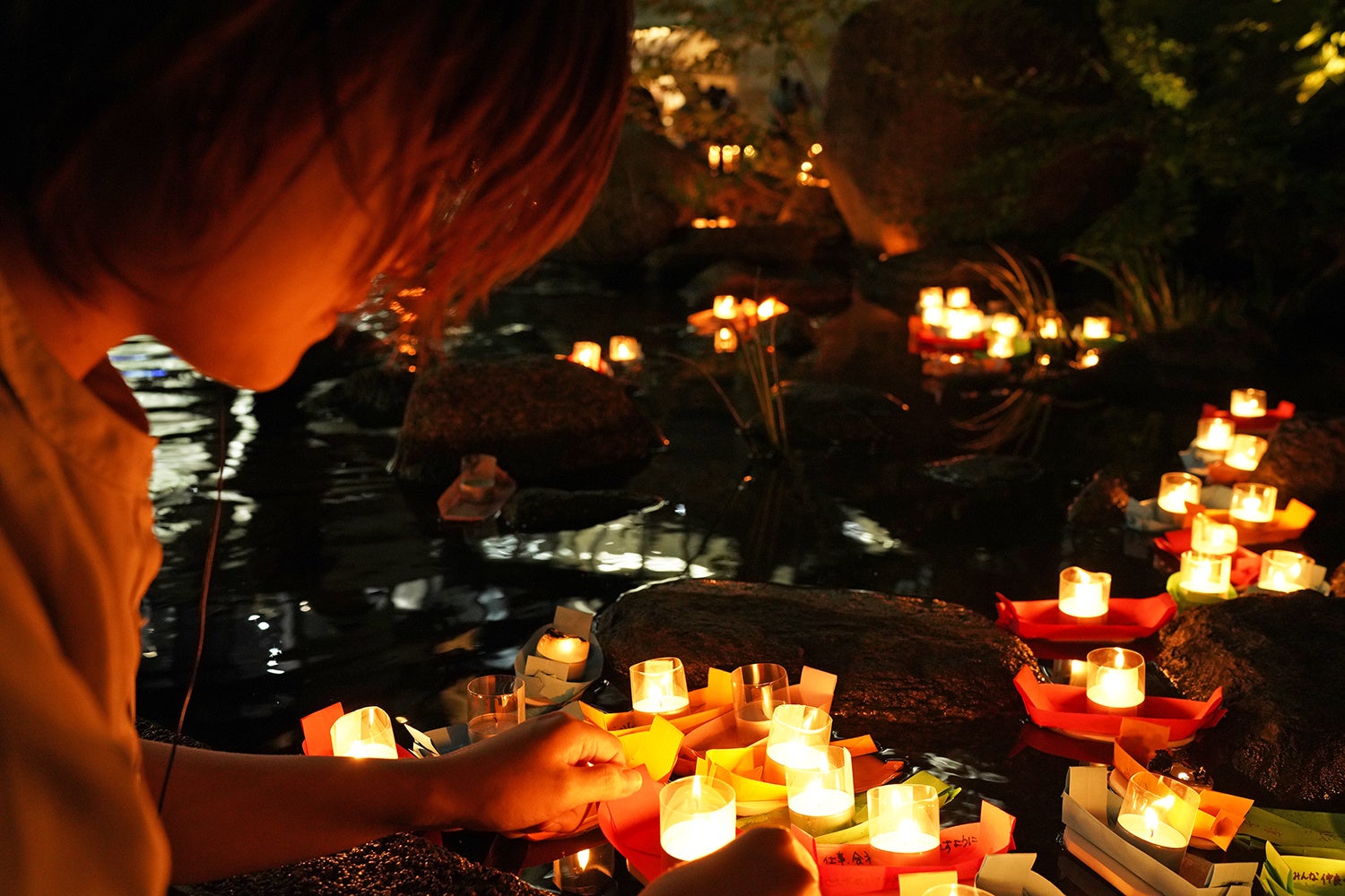 あなたのお願いに一番近い色を選んだら、願いごとを書いて笹舟を織り、想いを込めて池に浮かべてください。