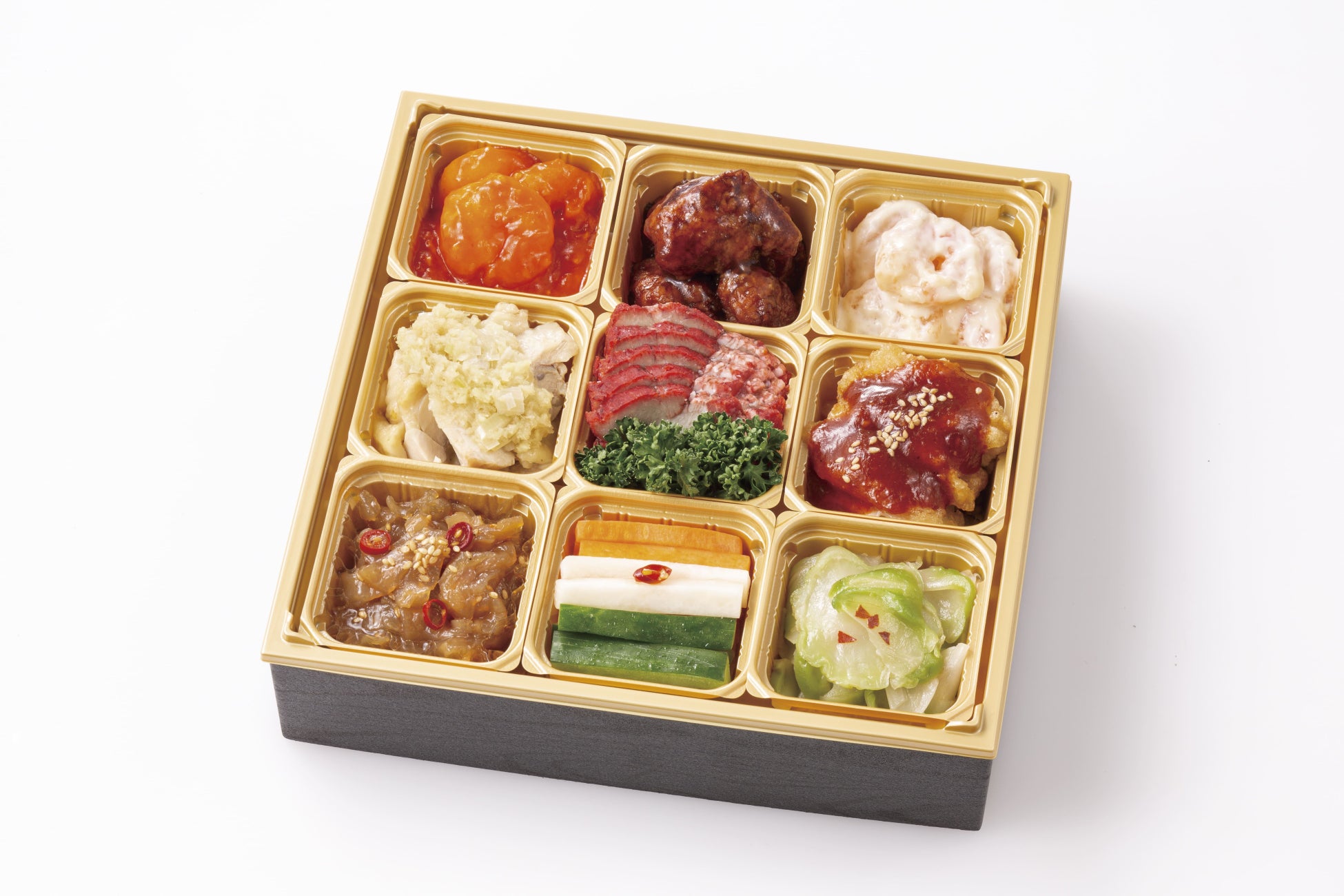海老マヨ、海老チリ、蒸し鶏生姜、黒酢酢豚、紅チャーシュー、四川油淋鶏、中華クラゲ、上海ラースー菜、緑ザーサイなど、人気のお惣菜の盛り合わせです。(2〜3名様用)