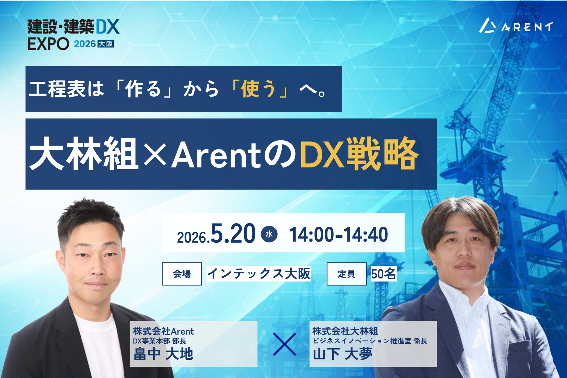 株式会社Arent(本社:東京都港区、代表取締役:鴨林広軌、東証グロース:5254)は、産業DX展内「建設・建築DX EXPO」に初出展し、初日には株式会社大林組と「工程表は『作る』から『使う』へ」をテーマとした対談セミナーに登壇いたします。