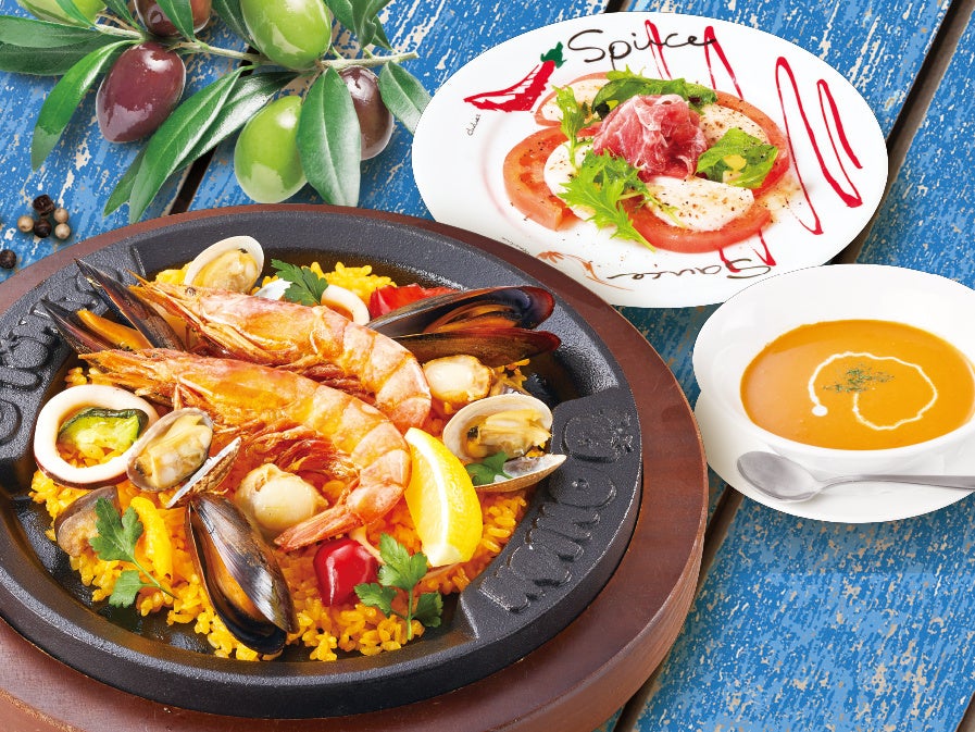 セット内容:具だくさんシーフードのパエリア、生ハムとトマトとモッツァレラのカプレーゼ、冷製ビスクスープ