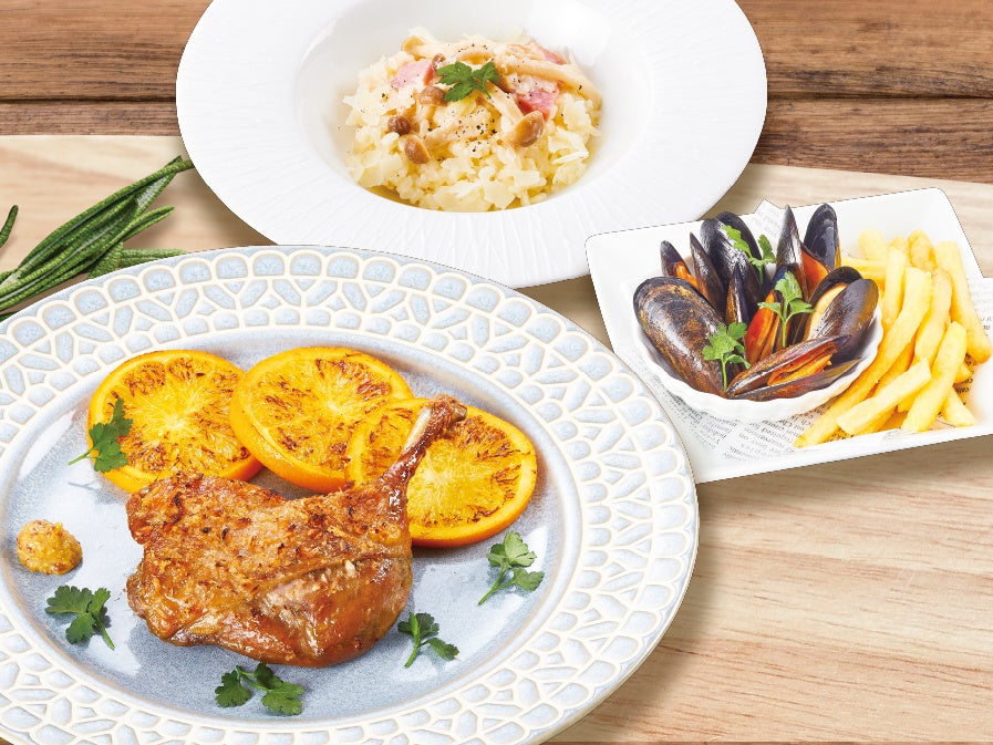 セット内容:鴨のコンフィ ~焼きオレンジを添えて~、きのことチーズのリゾット(ミニサイズ)、おつまみムール貝&ポテト