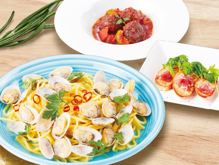 セット内容:たっぷりあさりのボンゴレビアンコ、アルボンディガス ~スペイン風ミートボール~、生ハムのカナッペ