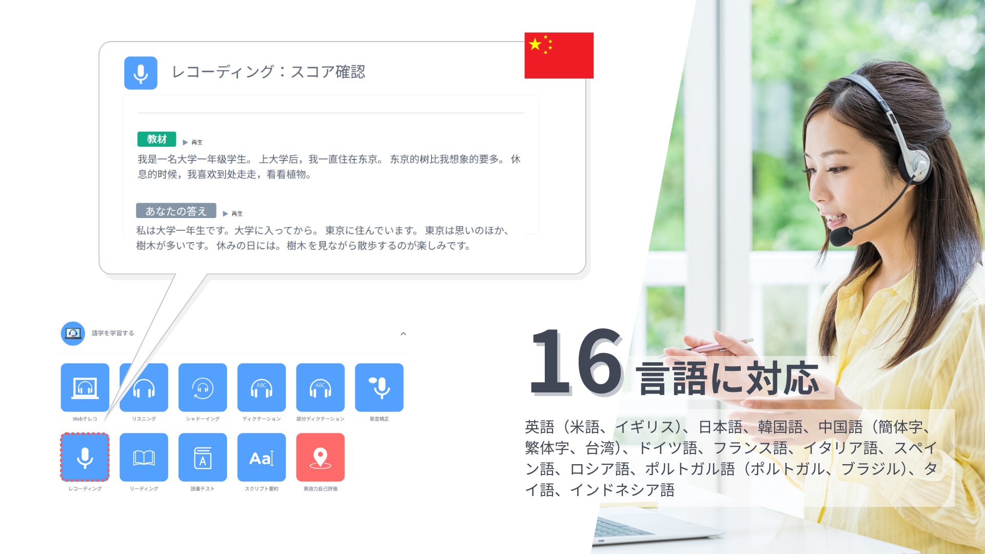 『CaLabo® MX』のレコーディング課題では、録音した結果を文字化し、自分の発音がどのように認識されたかを視覚的に確認できます。これまでは、英語または教材と同じ言語でのみ発話を認識・文字化していましたが、録音時の言語を16言語*から任意に指定できるようになりました。これにより、英語以外の言語で録音テストを実施したり、通訳の授業で訳を録音して先生に提出するといったご利用も可能になり、活用の幅が広がります。