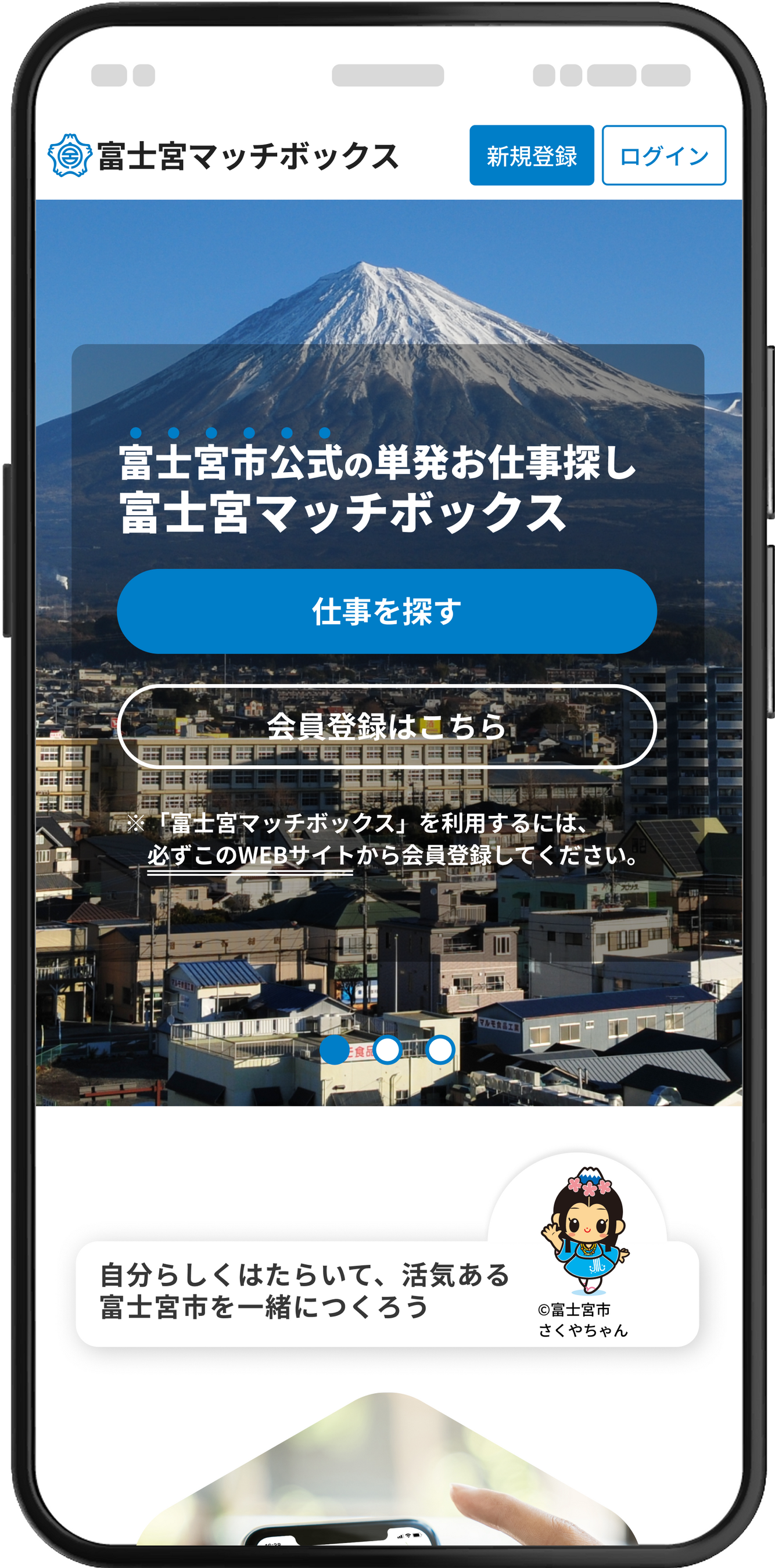 「富士宮マッチボックス」は、富士宮市公式の人材マッチングサイトです。求職者はスマートフォンなどから手軽に求人を検索し、簡単に応募することができます。自身の都合や希望に合わせ、1日・数時間単位での柔軟な就労が可能なため、子育て中の女性、学生、定年退職後のシニア層など、幅広い層の求職者がそれぞれのライフスタイルに合わせて活躍できます。また、自治体が運営するため信頼性が高く、休業手当の自動判定といった労働者保護の仕組みやトラブル時のサポート体制等も整備されており、安心してご利用いただけます。