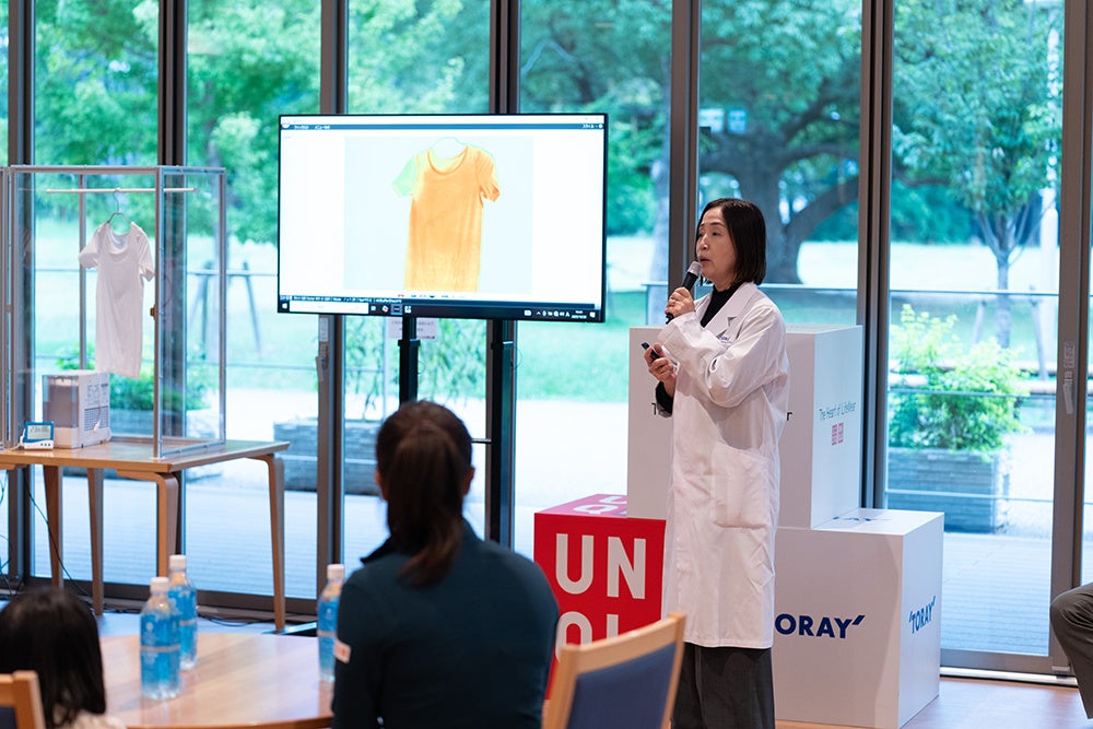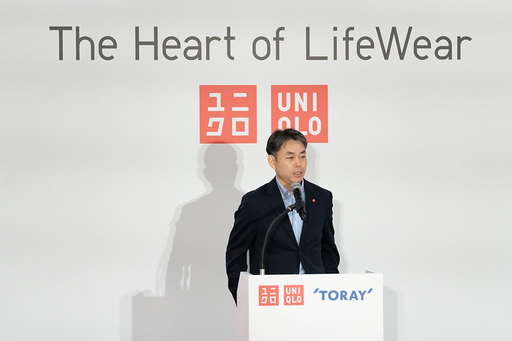 続いて、東レ株式会社 GO事業部長の大川 倫央氏から、The Heart of Lifewear活動に2億円を寄付し、ユニクロと協働し本活動を進めていくことが発表されました。今後は、ヒートテックが生産されている国内外の拠点地域でも、The Heart of LifeWearの活動や発信をユニクロと共に行い、両社のものづくりを支えてくれている地域の方々に感謝の気持も伝えていきたいと語りました。