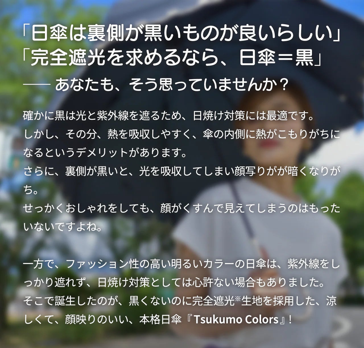 Tsukumo Colorsは、ファッションも快適さもUV対策もすべて叶える、新発想の日傘です。