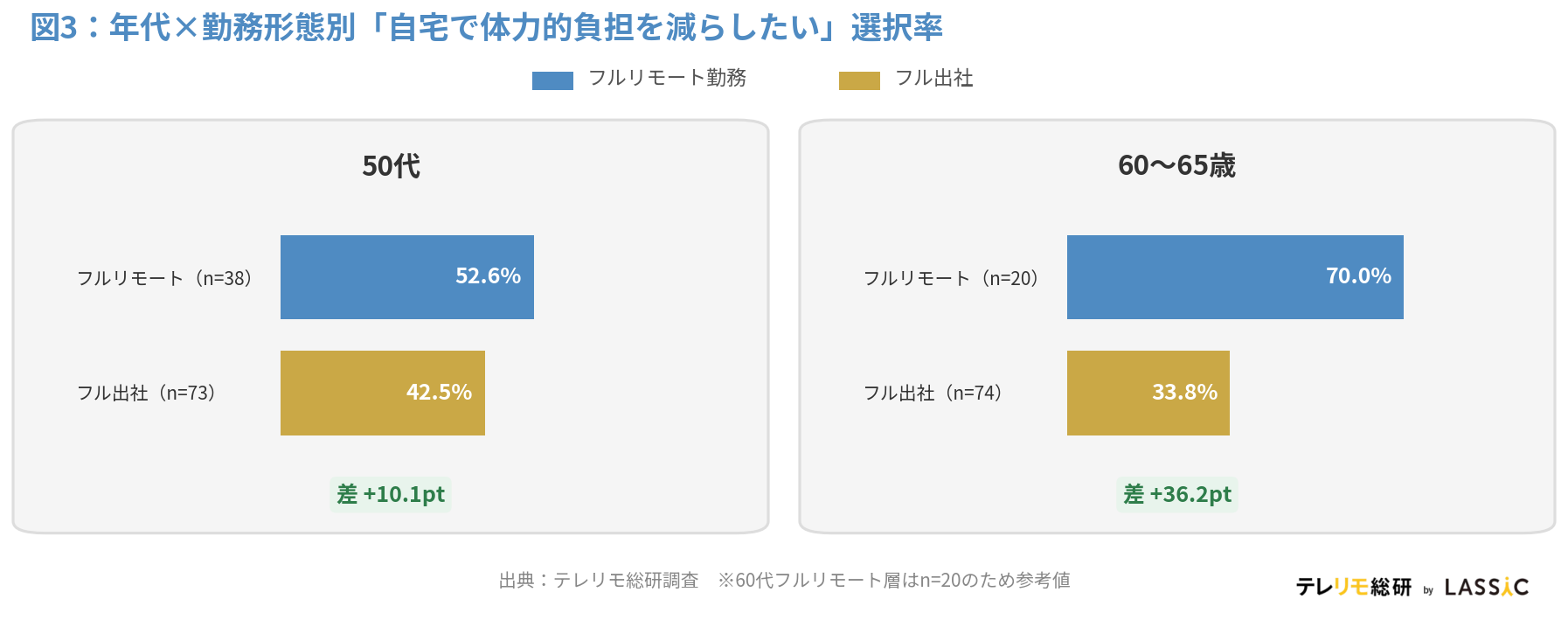 60代フルリモート層の70.0%が「自宅で体力的負担を減らしたい」と回答(フル出社層との差+36.2ポイント)