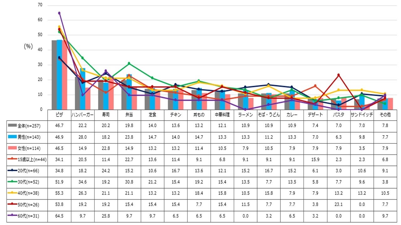 ●「ハンバーガー」「寿司」「弁当」から20ポイント以上を引き離し、デリバリーで一番利用されていたのは「ピザ」
