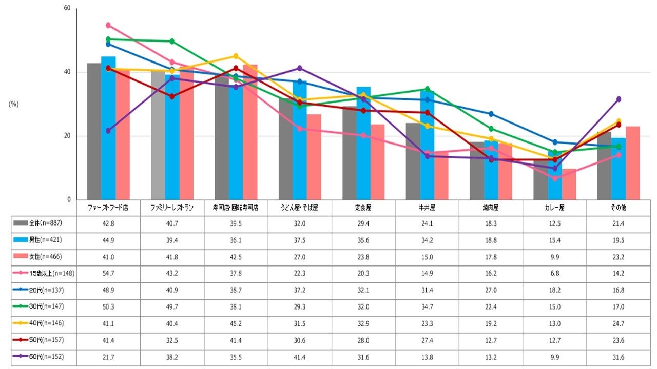 外食先の1位は「ファーストフード店」が全体で42.8%。次いでファミリーレストラン(40.7%)、寿司店・回転寿司店(39.5%)と上位を占めている。60代は「うどん屋・そば屋」が1位。