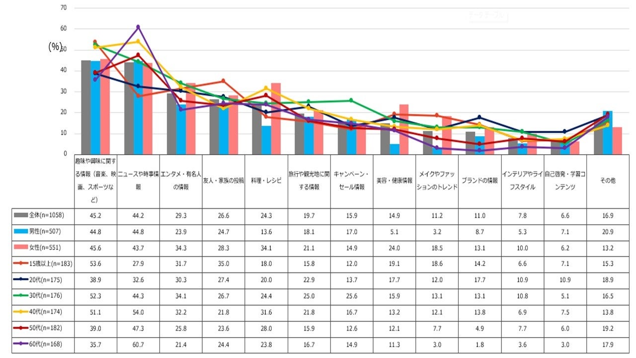 SNSの利用率は88.2%。「趣味や興味に関する情報」「ニュースや時事情報」に関する情報はSNSでチェック。60代も「ニュースや時事情報」は6割がSNSでチェック。