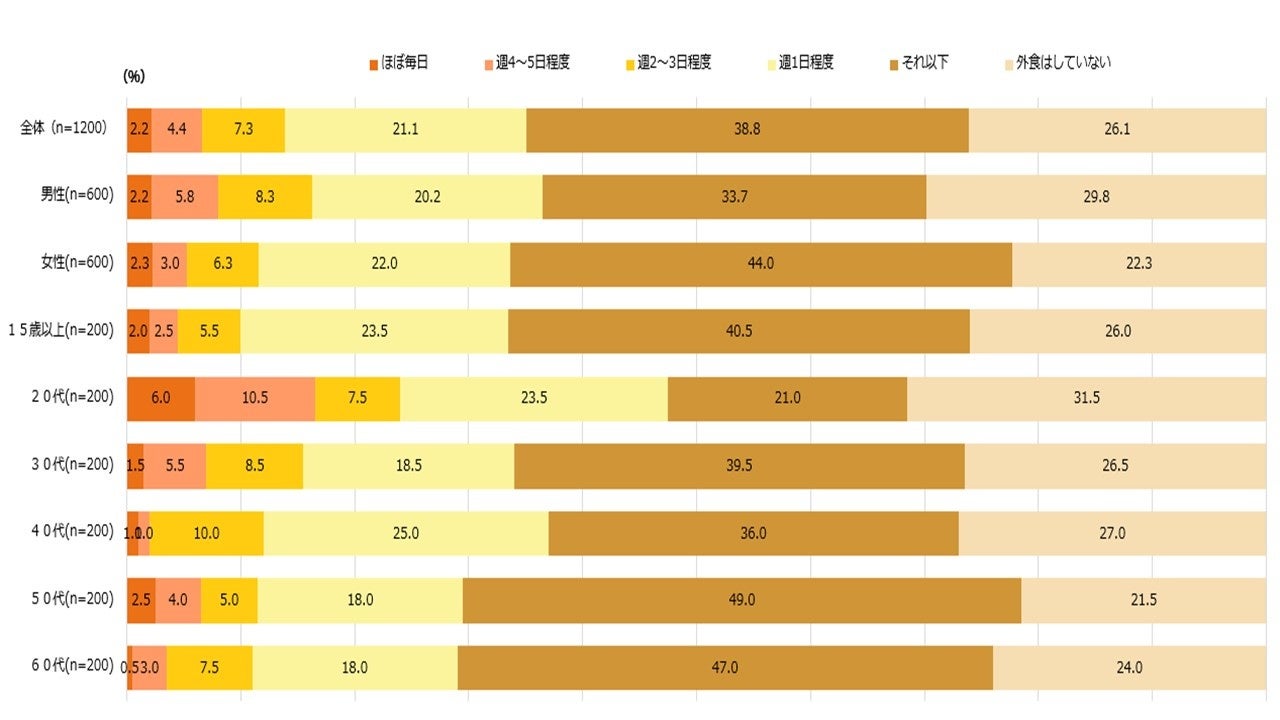お酒を伴わない外食の頻度が一番高いのは20代で週1回以上外食をしている人が47.5%。