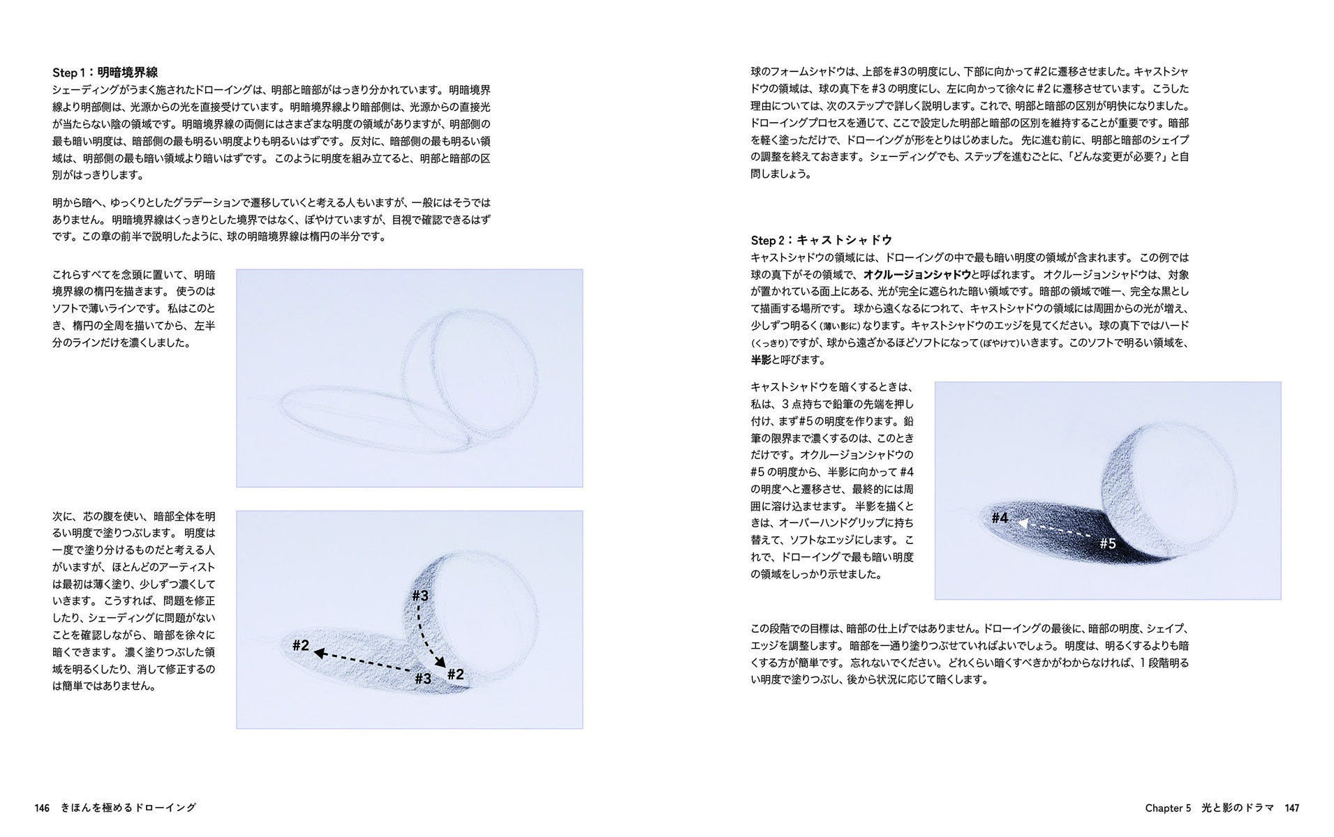本書は鉛筆の持ち方にはじまり、線の引き方、立体の描き方、シェーディング、人物まで、ドローイングのすべてのプロセスをはじめから順に解説していきます。