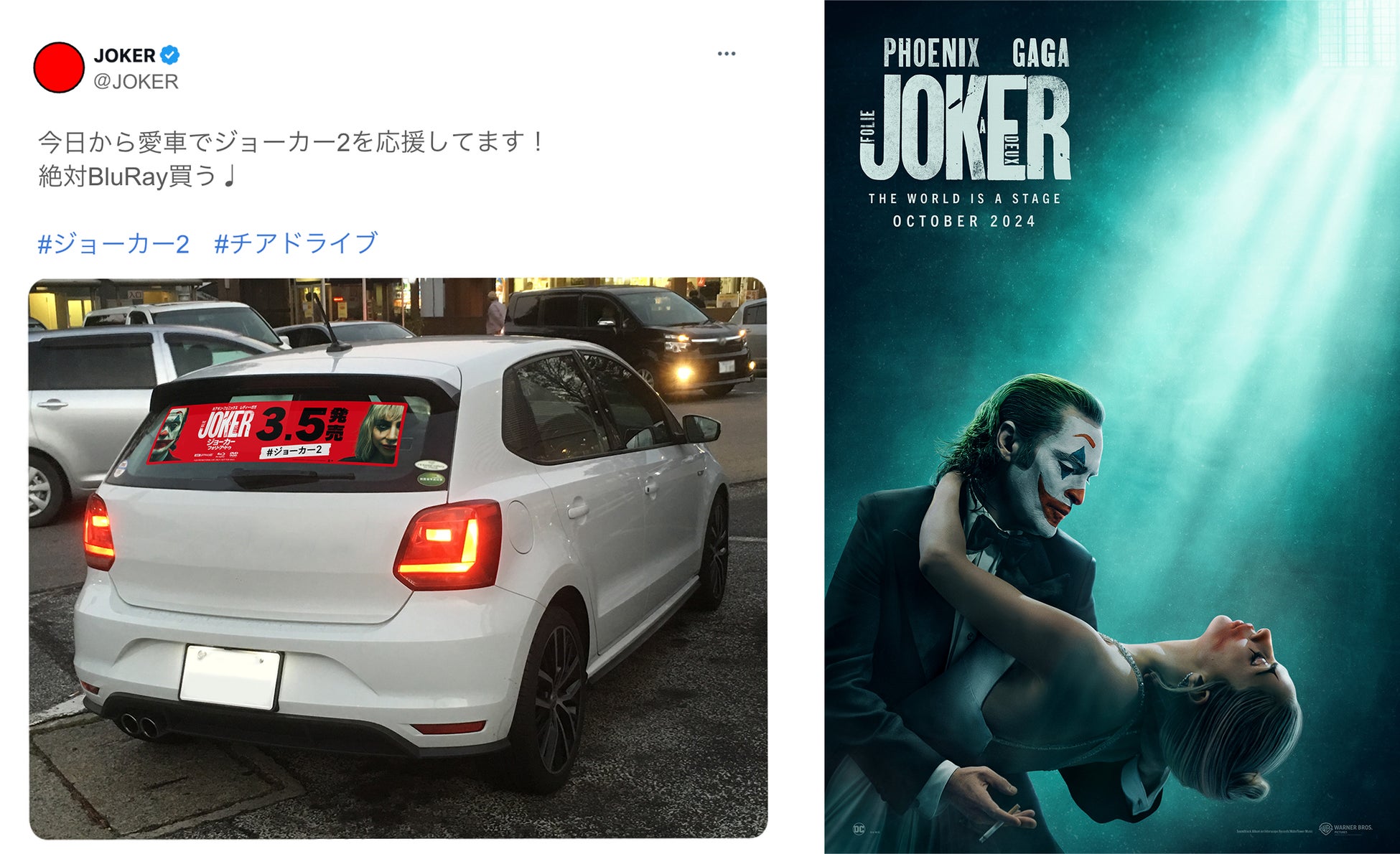 株式会社チアドライブ(本社:東京都中央区、代表取締役社⻑:保科昌孝、 http://cheerdrive.jp/ )が運営する、⼀般ドライバーが愛⾞に好きなブランドやコンテンツのステッカーを貼って⾛⾏することでお礼として⾛⾏距離に応じたスポンサー収⼊が得られるマイカー広告サービス「CheerDrive(チアドライブ)」は、「4K ULTRA HD/ブルーレイ&DVD発売記念!映画『ジョーカー2』ドライブPRキャンペーン」の受付を2025年1月8日(水)より開始します。