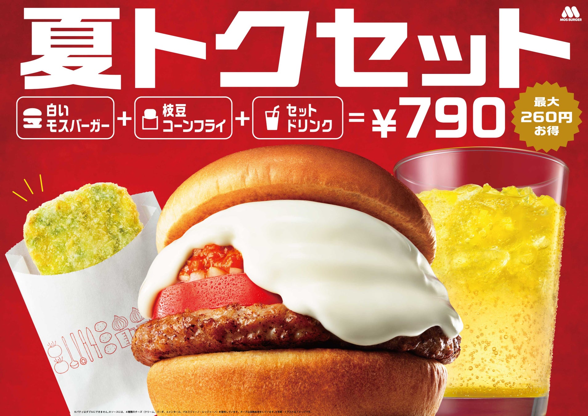「夏トクセット」は、夏の期間限定メニューをお得にお求めいただけるセットです。セット内容は、「白いモスバーガー」+「枝豆コーンフライ」+「セットドリンク」の組み合わせです。